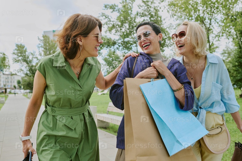 Женщины среднего возраста смеются вместе, когда ходят по магазинам на улице