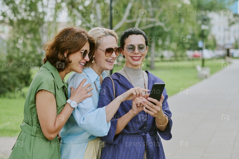 Три молодых взрослых женщины смеются, глядя на смартфон в открытом воздухе