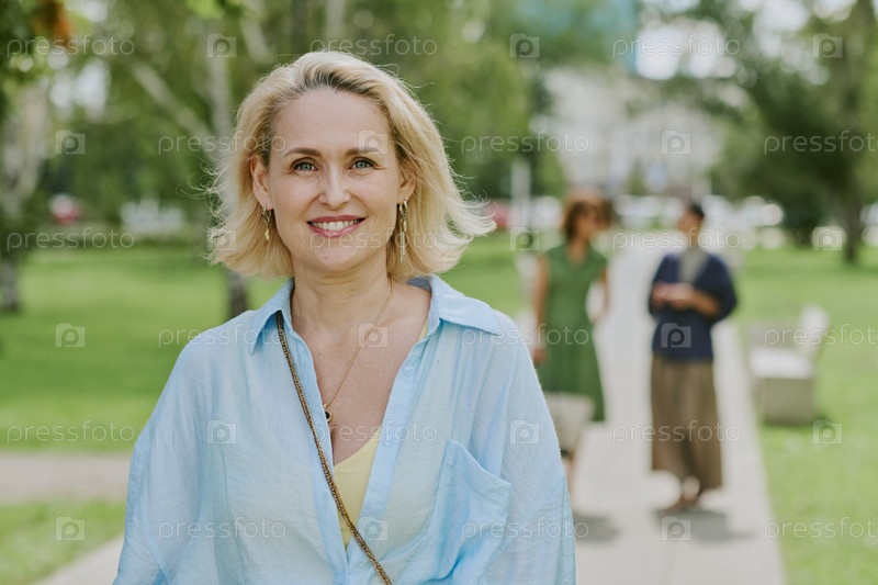 Портрет женщины среднего возраста, улыбающейся на улице в городском парке