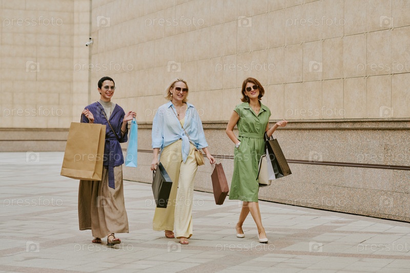 Три женщины гуляют на открытом воздухе, неся сумки с покупками и улыбаясь