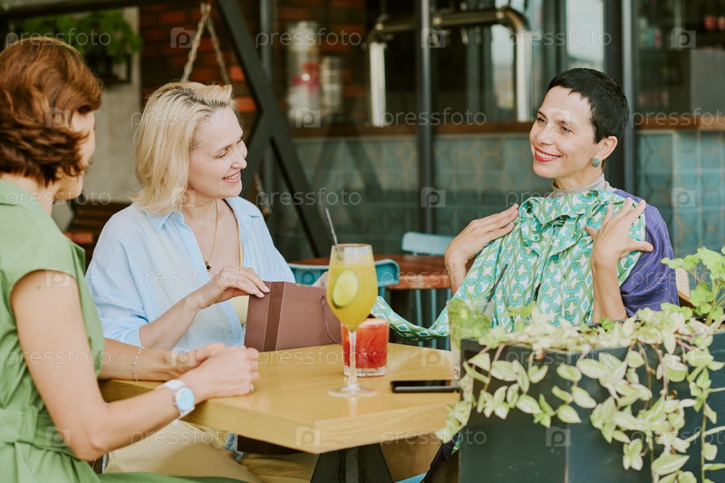 Женщины среднего возраста общаются и улыбаются вместе за столом в кафе