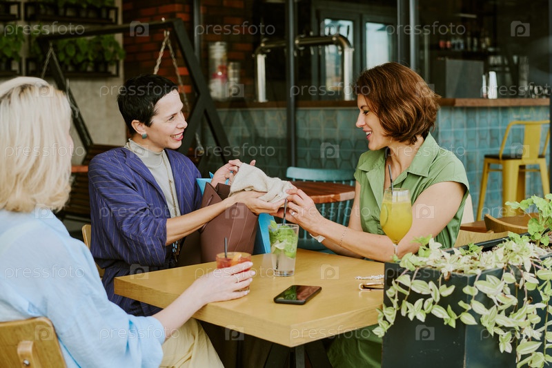 Три женщины общаются и обмениваются подарками за столом в кафе