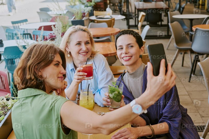 Группа женщин среднего возраста, делающих селфи и наслаждающихся напитками на открытом воздухе