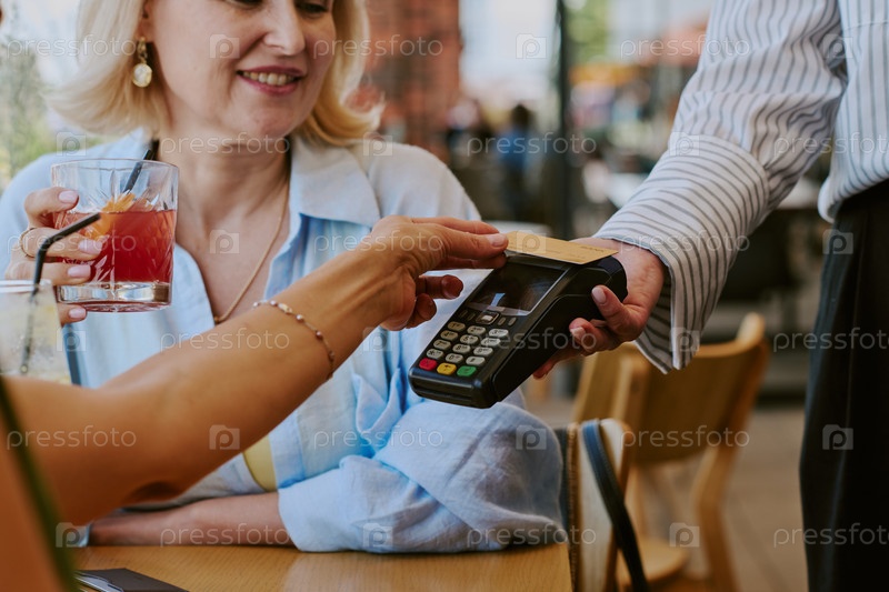 Женщина средних лет делает бесконтактные платежи за столом в ресторане