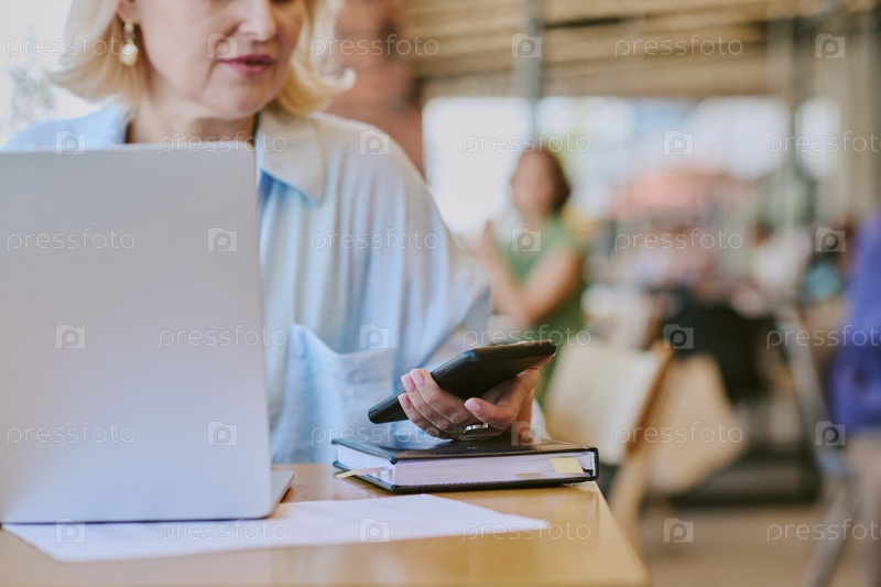Женщина среднего возраста использует смартфон, работая на ноутбуке в помещении