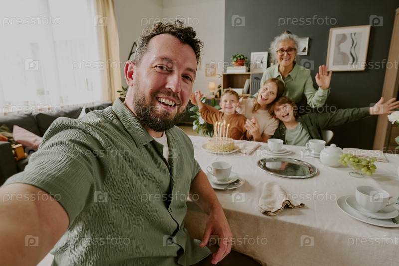 Портрет мужчины, делающего селфи с многонациональной семьей, празднующей день рождения