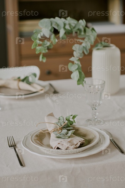 Элегантное столовое убранство с тарелкой с салфеткой и зеленым украшением
