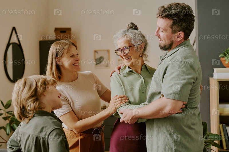 Мужчина среднего возраста обнимает старшую женщину в помещении