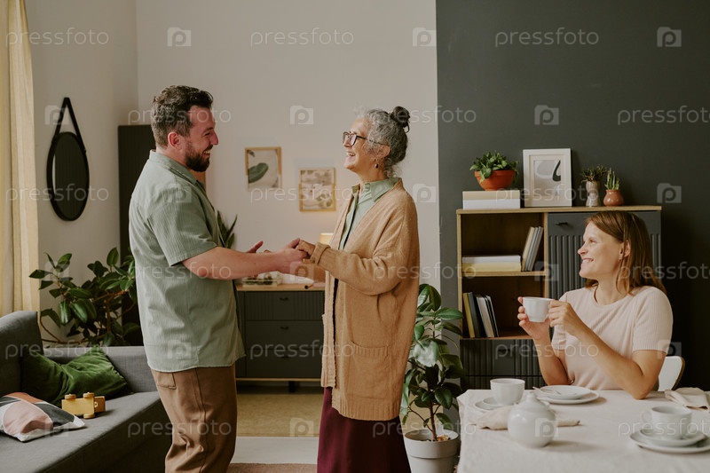 Мужчина среднего возраста держит за руки старшую женщину, улыбающуюся
