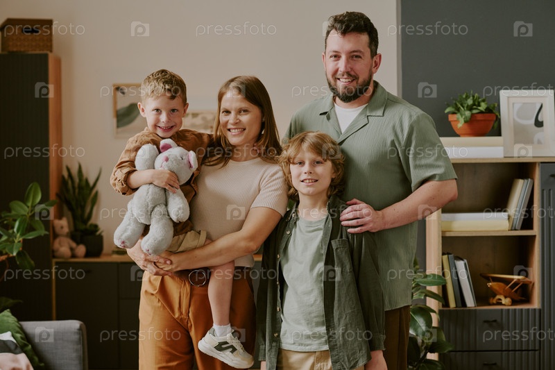 Семья улыбается вместе с юными мальчиками и матерью, держащей медведя