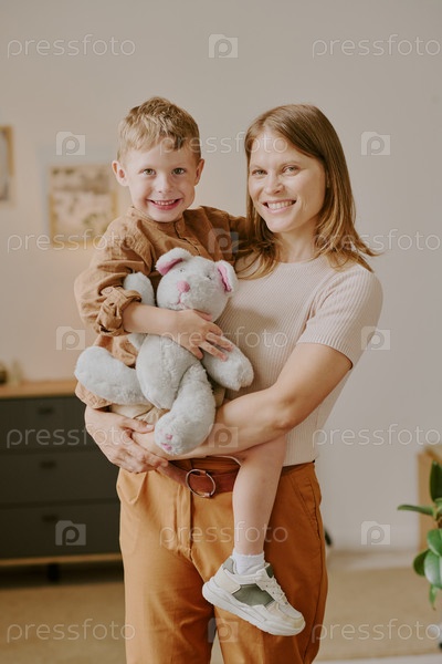 Молодая женщина держит улыбающегося мальчика с набитым животным