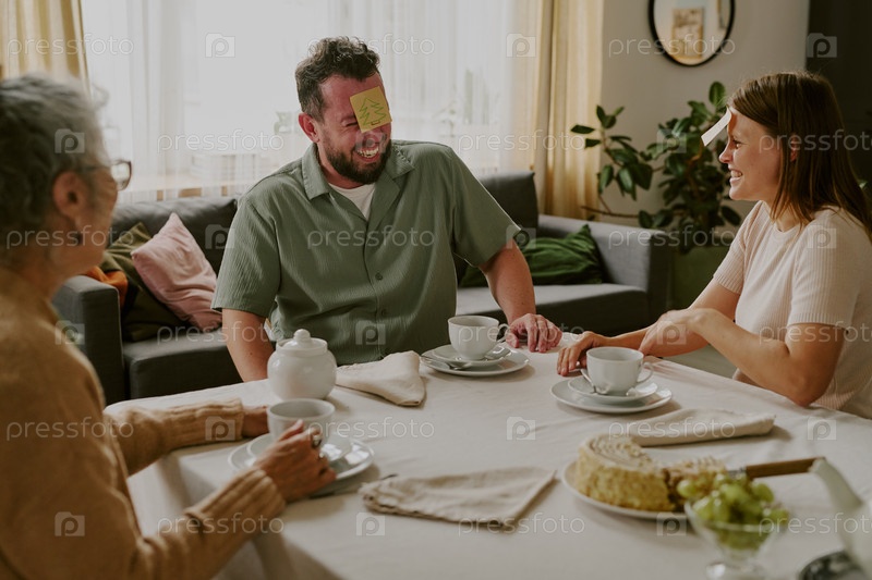 Молодой взрослый мужчина смеется со старшей женщиной и молодой взрослой женщиной