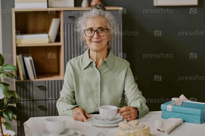Портрет пожилой женщины, улыбающейся, сидящей за столом и пьющей чай