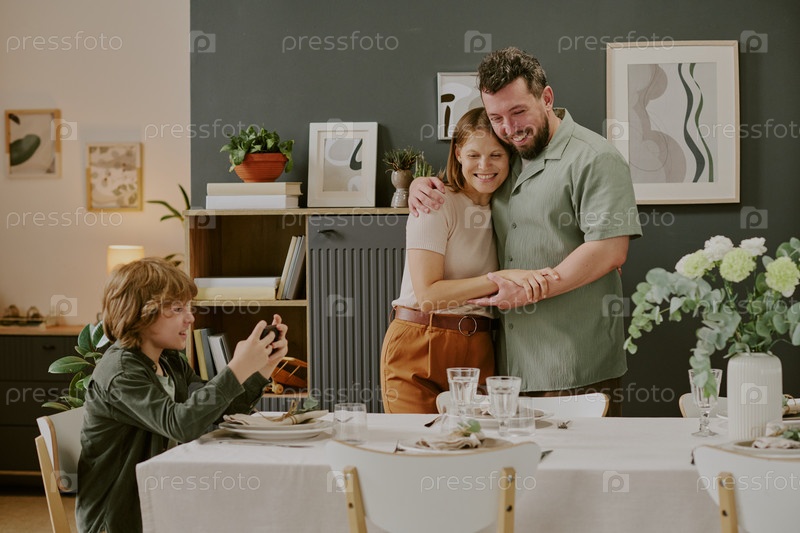 Пара средних лет улыбается, пока мальчик-подросток фотографирует