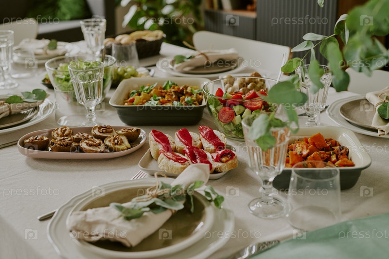 Разнообразные вегетарианские блюда расположены на обеденном столе во время праздничного собрания