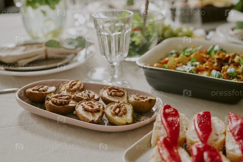 Ближайшее изображение вегетарианских закусок с наполненными грушами и грецкими орехами на столе