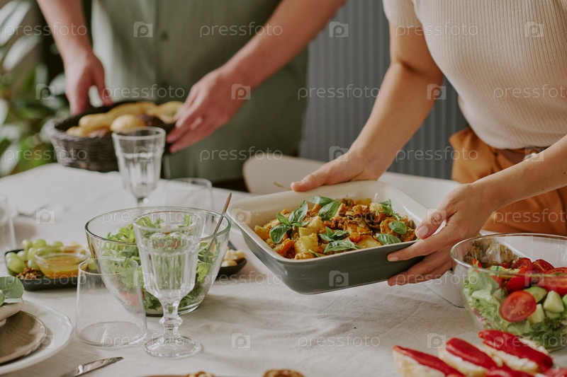 Молодая женщина подает салат, в то время как молодой человек готовит еду за столом