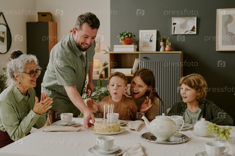 Выдувая свечи на день рождения, мальчик в окружении семьи празднует