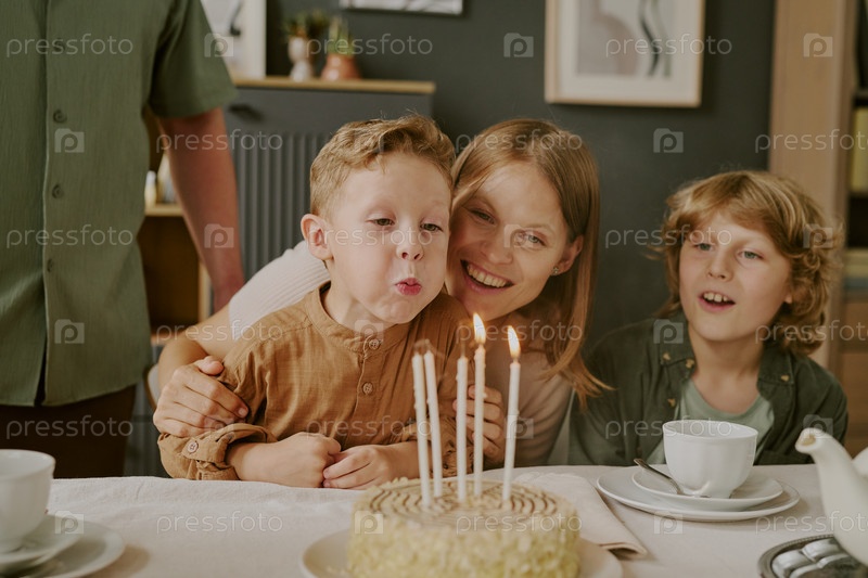 Детка, дующая в рождественские свечи с улыбающейся матерью и братом