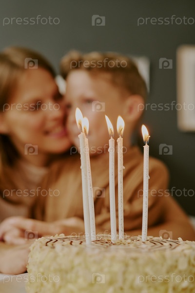 Мать обнимает молодого мальчика, пока горят свечи от торта на день рождения