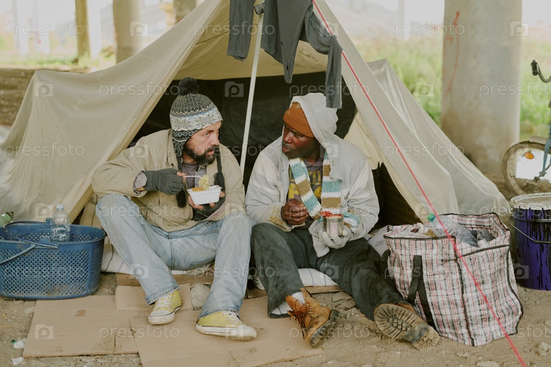 Бездомный и чернокожий едят вместе за палаткой