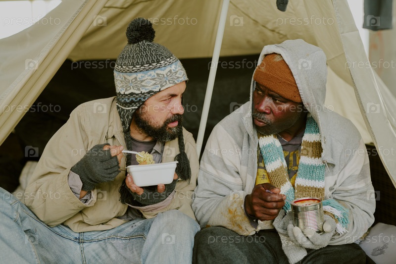 Бездомный и бездомный чернокожий едят вместе на свежем воздухе