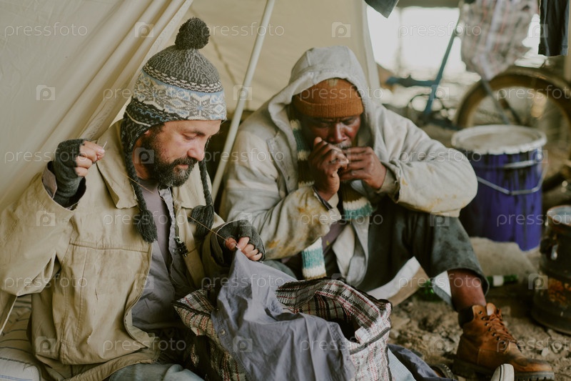Бездомный и чернокожий сидят на улице, делятся едой