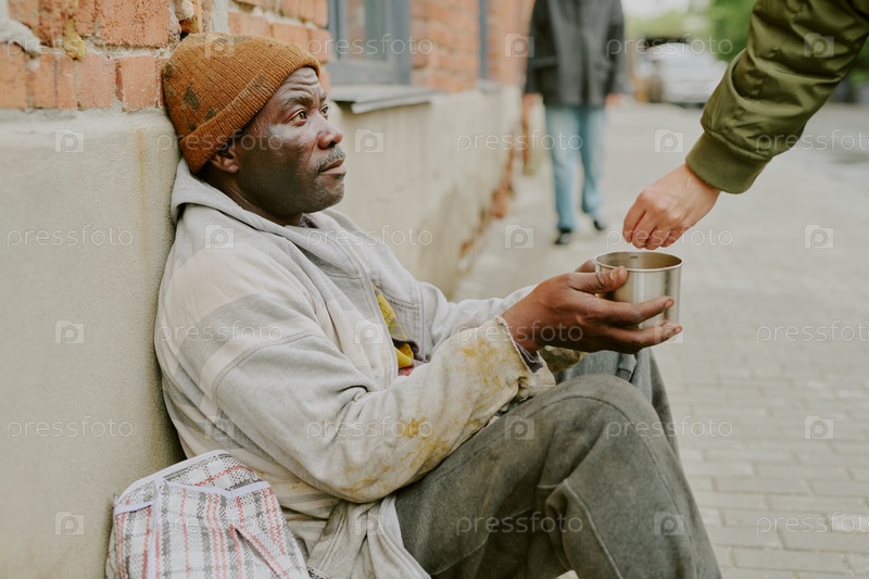 Бездомный чернокожий мужчина сидит на улице, получая деньги от незнакомца