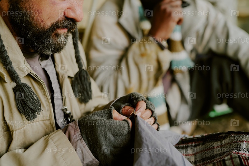 Бездомный мужчина шиет ткань, сидя рядом с другим человеком