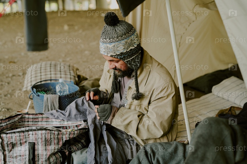 Бездомный сидит на улице, ремонтирует одежду возле палатки