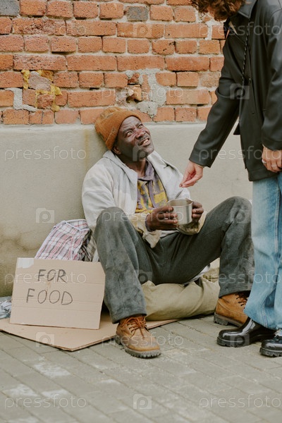 Бездомный чернокожий мужчина сидит на улице, получая пожертвование еды от незнакомца