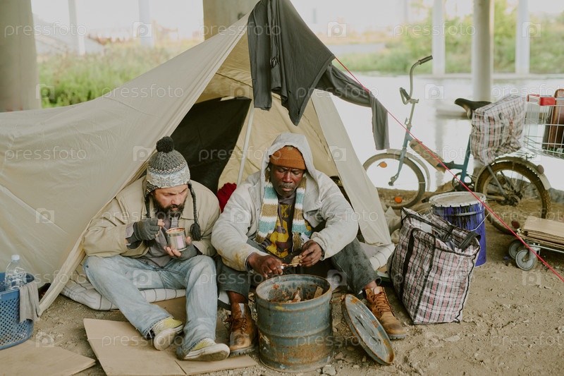Бездомный и чернокожий сидят в палатке и едят на свежем воздухе
