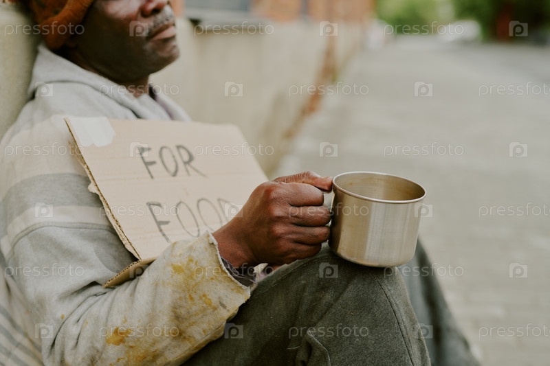 Бездомный чернокожий мужчина сидит на тротуаре, держит чашку и ищет продовольственную поддержку
