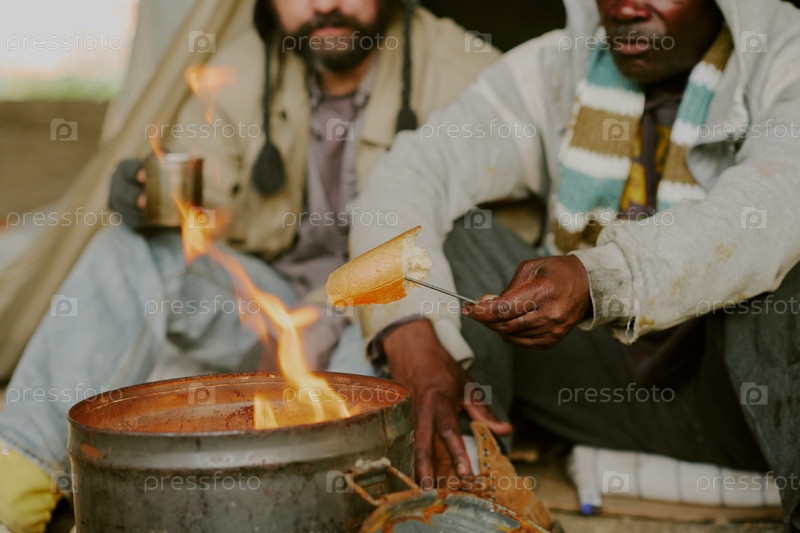 Бездомный и чернокожий пекут хлеб на костре