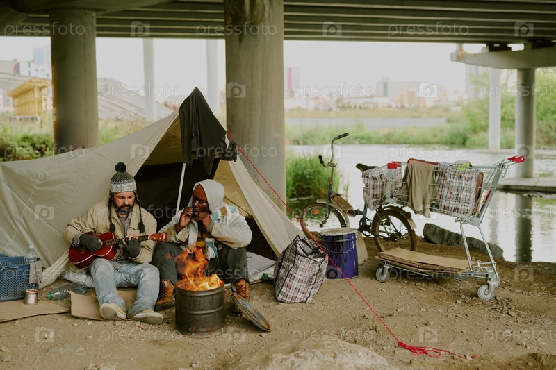 Два бездомных сидят у костра, играют на гитаре и гармонике на свежем воздухе