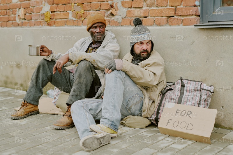 Бездомный чернокожий и мужчина сидят на улице, прося еды