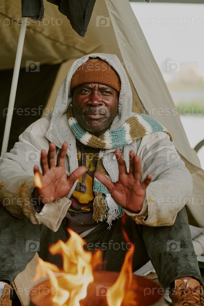 Бездомный чернокожий мужчина согревает руки у костра в наружной палаточной обстановке