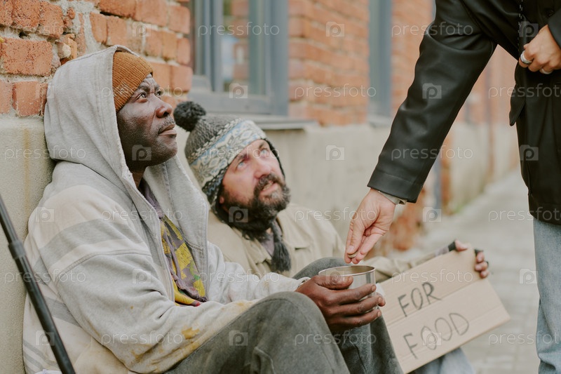 Бездомный чернокожий мужчина и человек, получающий пожертвования на еду в открытом воздухе