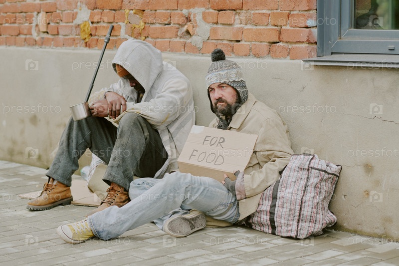 Бездомный и чернокожий сидят на улице, держа знаки с просьбой о помощи