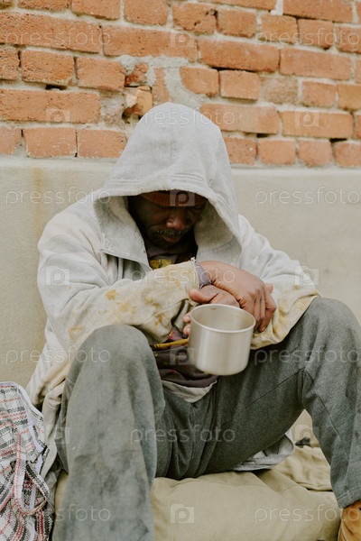 Бездомный чернокожий сидит на улице, держит металлический кубок и просит помощи