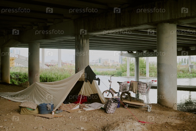Бездомный живет под мостом с велосипедом и корзиной рядом с рекой