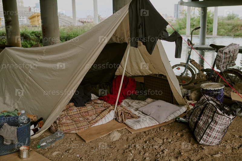 Временное шатровое укрытие под мостом, показывающее условия жизни бездомных
