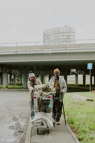 Бездомный и старший чернокожий мужчина ходят с корзиной на улице