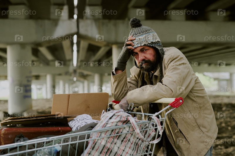 Бездомный человек, отдыхающий на корзине под городским мостом