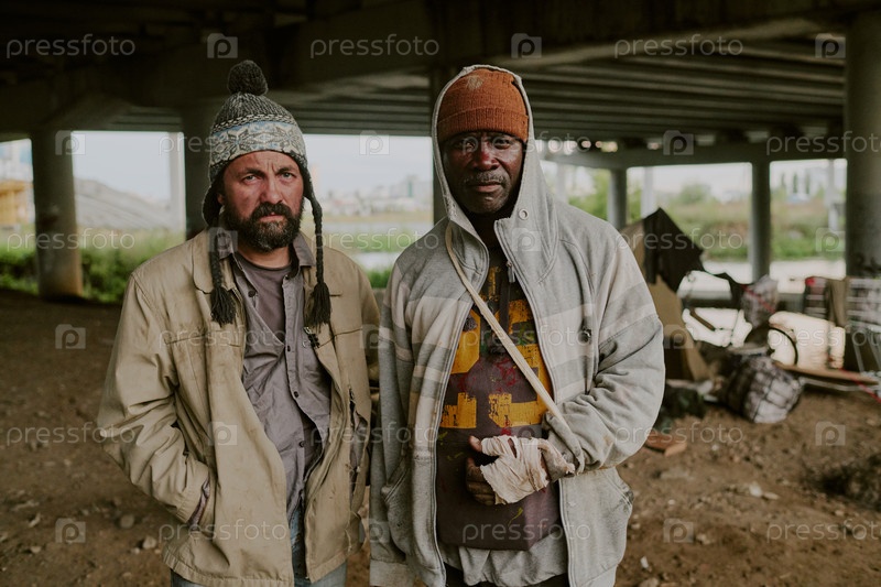 Бездомный и чернокожий стоят под мостом на открытом воздухе