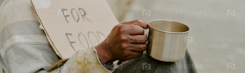 Бездомный чернокожий мужчина, держащий металлическую чашку и карточный знак в поисках помощи