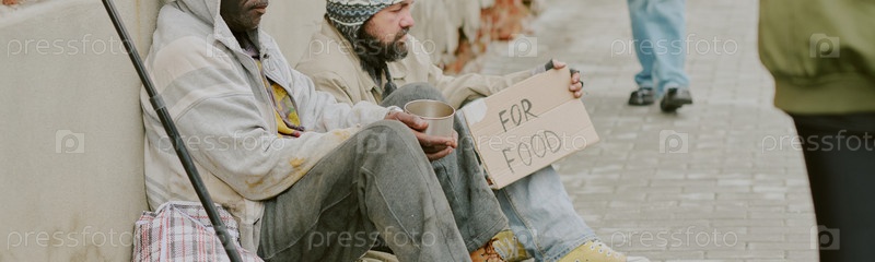 Бездомный чернокожий мужчина и сидящий на тротуаре мужчина держатся за пищевой знак