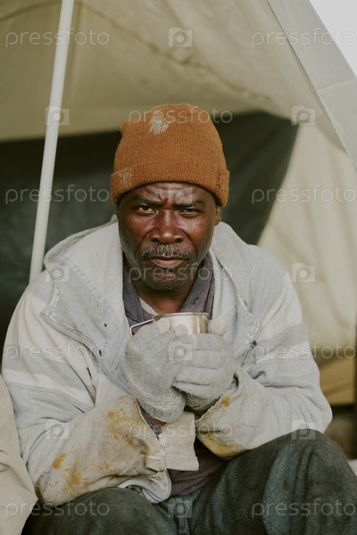 Портрет бездомного чернокожего мужчины, сидящего на улице и держащего металлический кубок