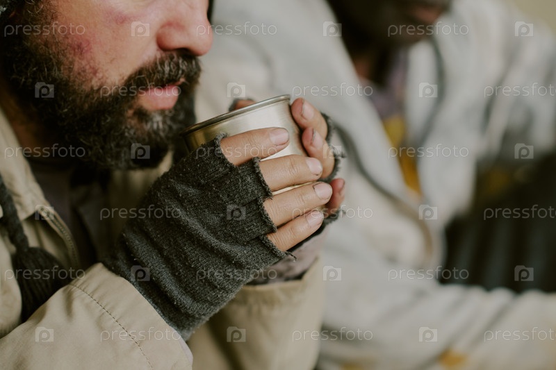 Бездомный мужчина, носящий безручные перчатки и пьющий из металлической чашки