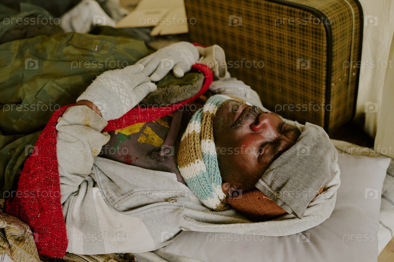 Бездомный чернокожий мужчина отдыхает в помещении с закрытыми глазами и сложенными руками